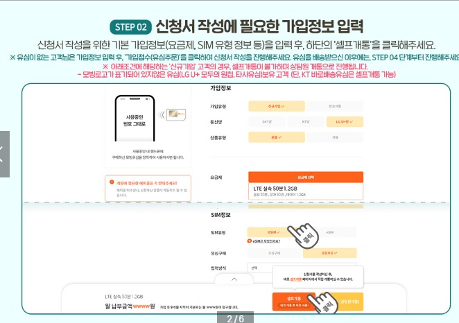 신청서작성에 필요한 가입정보 이력을 합니다. 신청서 작성을위한 가입정보(요금제, sim유형정보 등)을 입력 후 , 하단의 '셀프개통'을 클릭해주세요.
