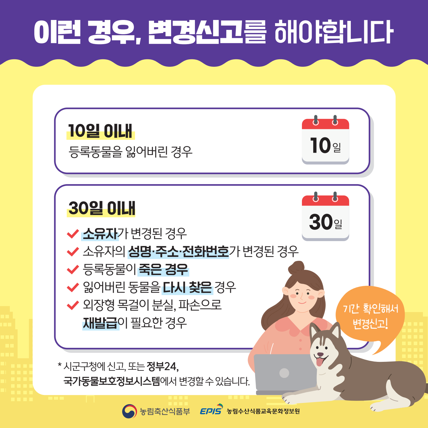 변경 신고는 해당 이벤트 발생 후 30일 이내, 분실된 반려견의 경우 10일 이내에 제출해야 합니다. 이를 통해 국가 데이터베이스의 정보가 정확하게 유지되며, 비상 시 효과적으로 사용할 수 있습니다.