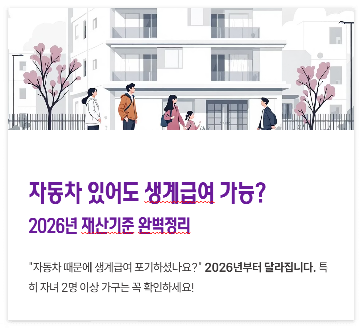 그런데 2026년, 이 모든 게 바뀝니다. 자동차 보유가 더 이상 생계급여의 절대적 장벽이 아니게 되는 거죠. 특히 자녀가 2명인 가구라면 반드시 확인해야 할 내용입니다.