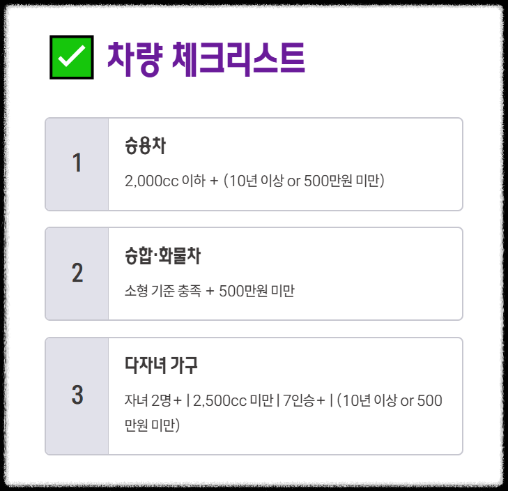 - 승용차: 2,000cc 이하 + 10년 이상 or 500만 원 미만