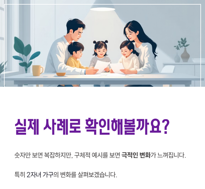 자, 그럼 이제 실제 사례를 통해 이 기준이 어떻게 적용되는지 확인해볼까요? 숫자로만 보면 복잡해 보이지만, 구체적인 예시를 보면 훨씬 이해하기 쉽습니다. 특히 2자녀 가구의 경우 극적인 변화를 경험하게 되는데요, 지금부터 실제 사례로 살펴보겠습니다.