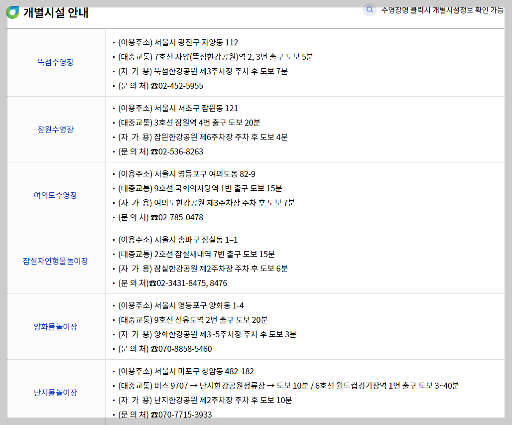 그럼 한강공원 수영장 및 물놀이장의 정보에 대해 알려드리겠습니다.