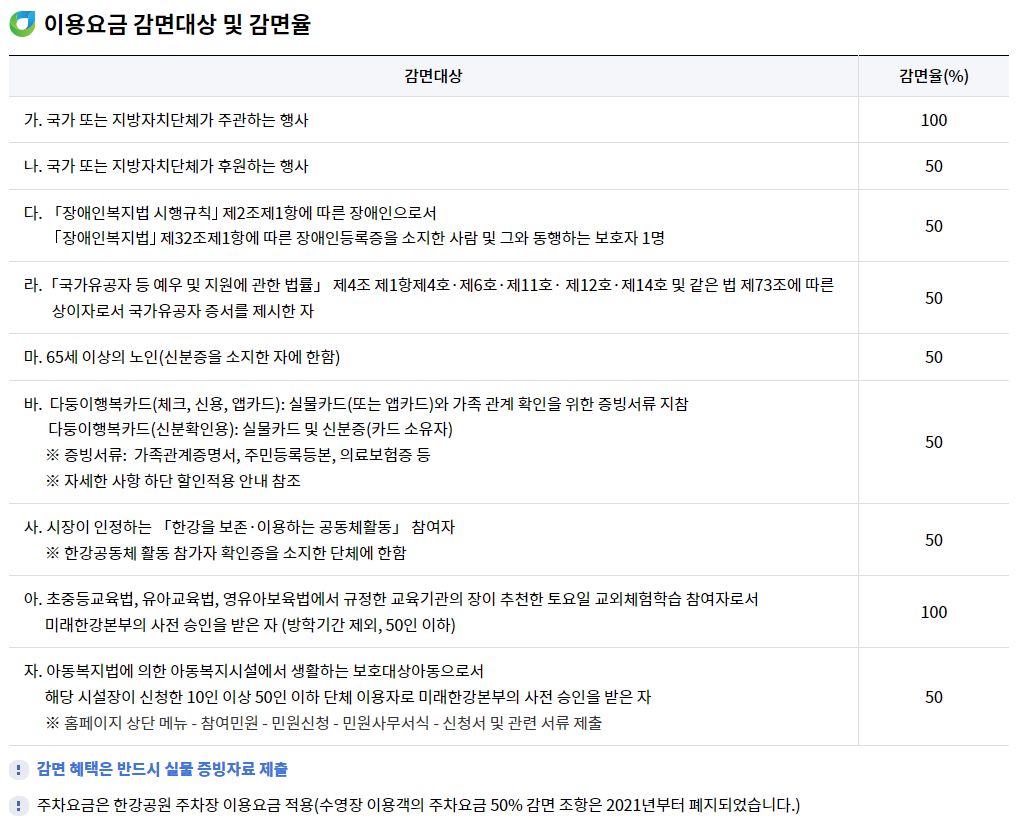 한강공원 수영장 및 물놀이장 이용요금 감면대상 및 감면율