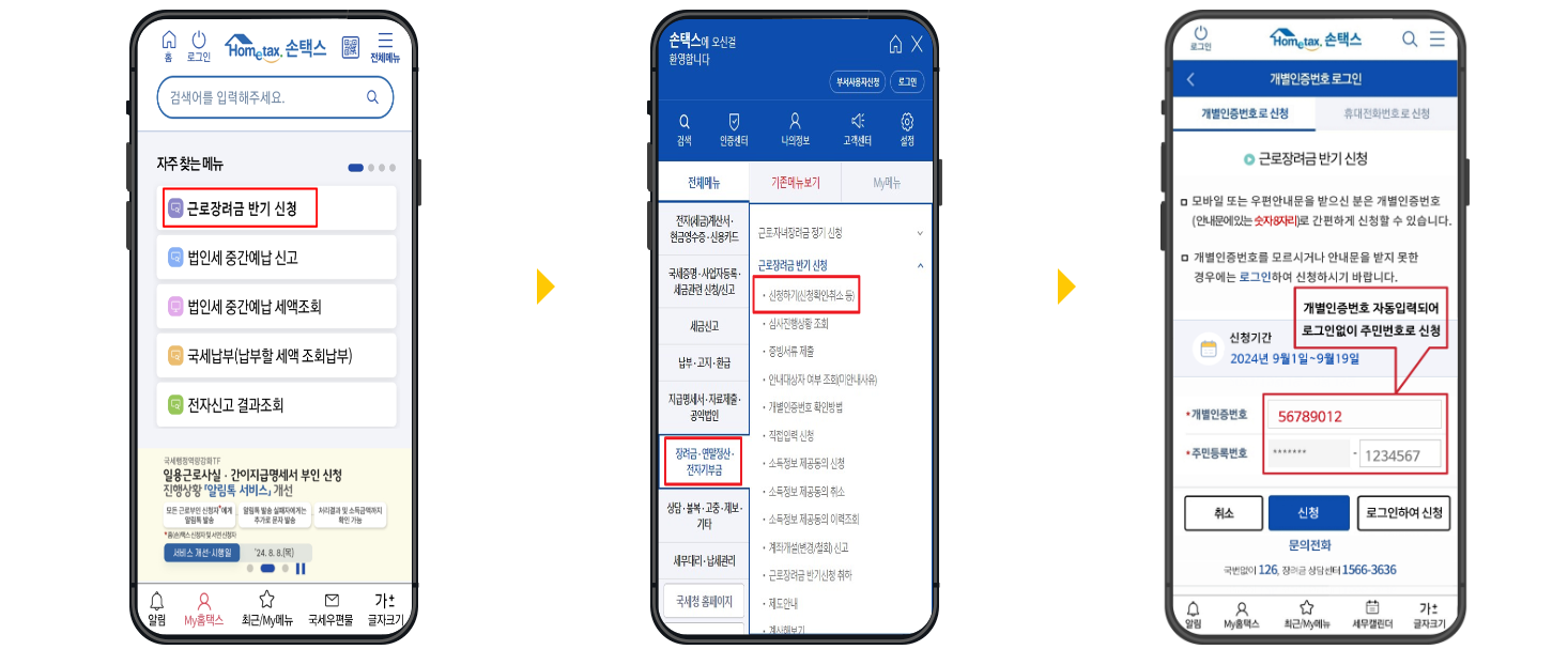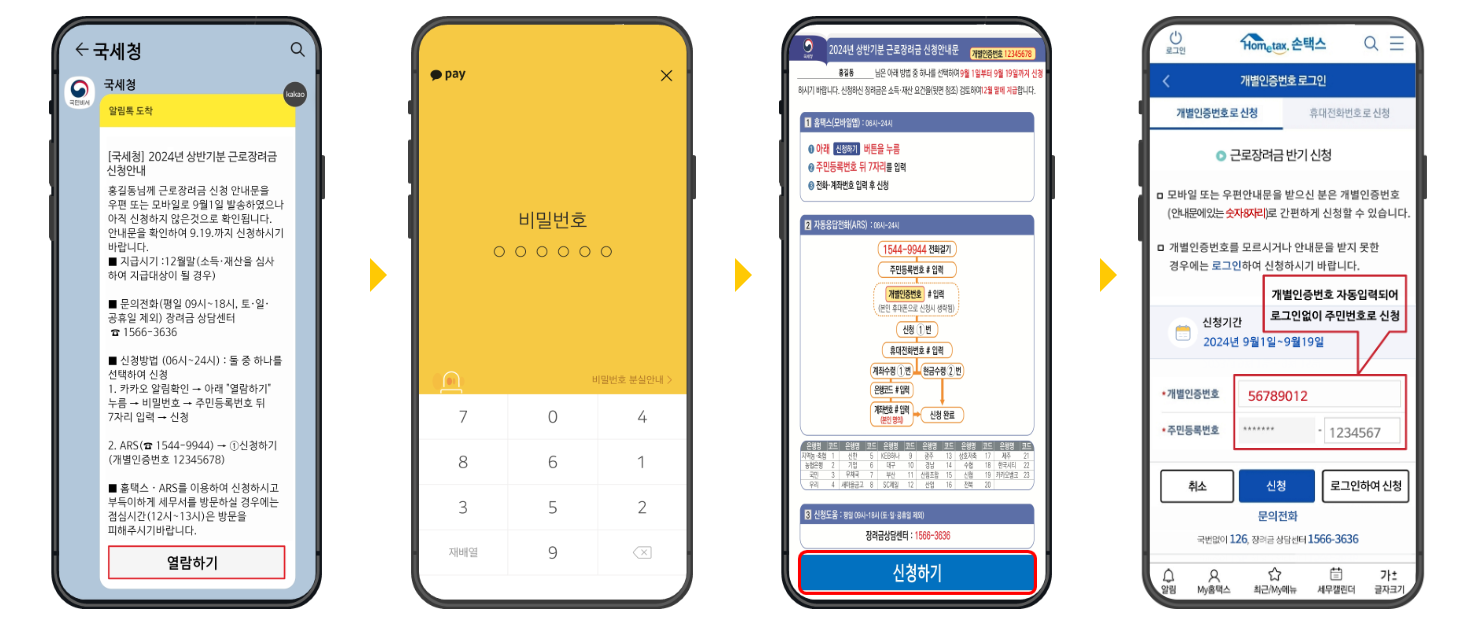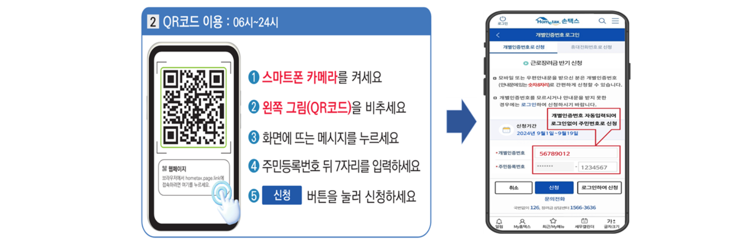 신청안내문에 있는 QR코드 스캔 → 개별인증번호가 채워진 홈택스 모바일앱 신청화면으로 이동 → 로그인 없이 주민등록번호 7자리 입력 → 신청