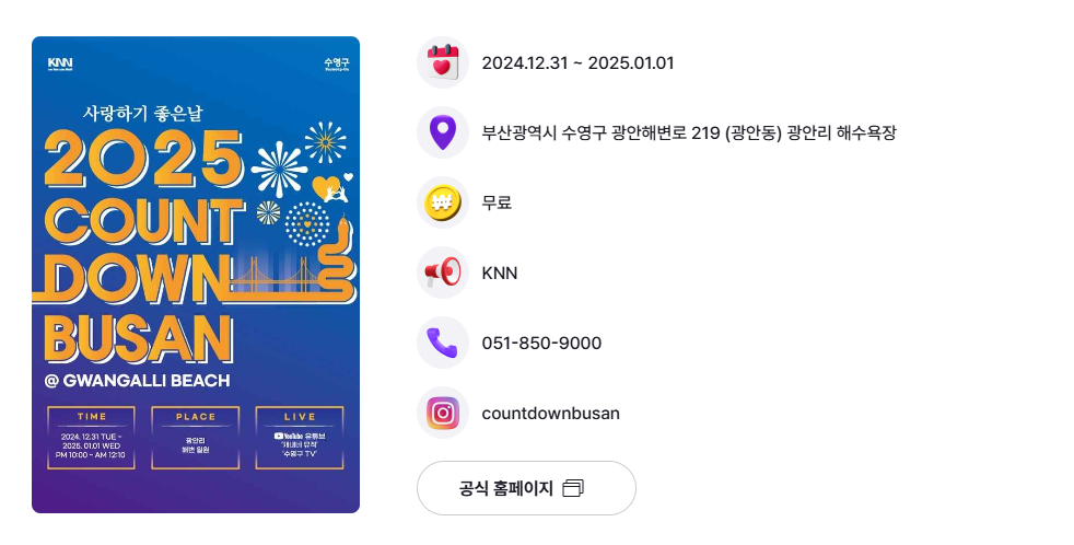 - 특징: 광안리 바다와 함께 새해 첫 해를 맞이하며 다양한 프로그램이 준비됩니다.