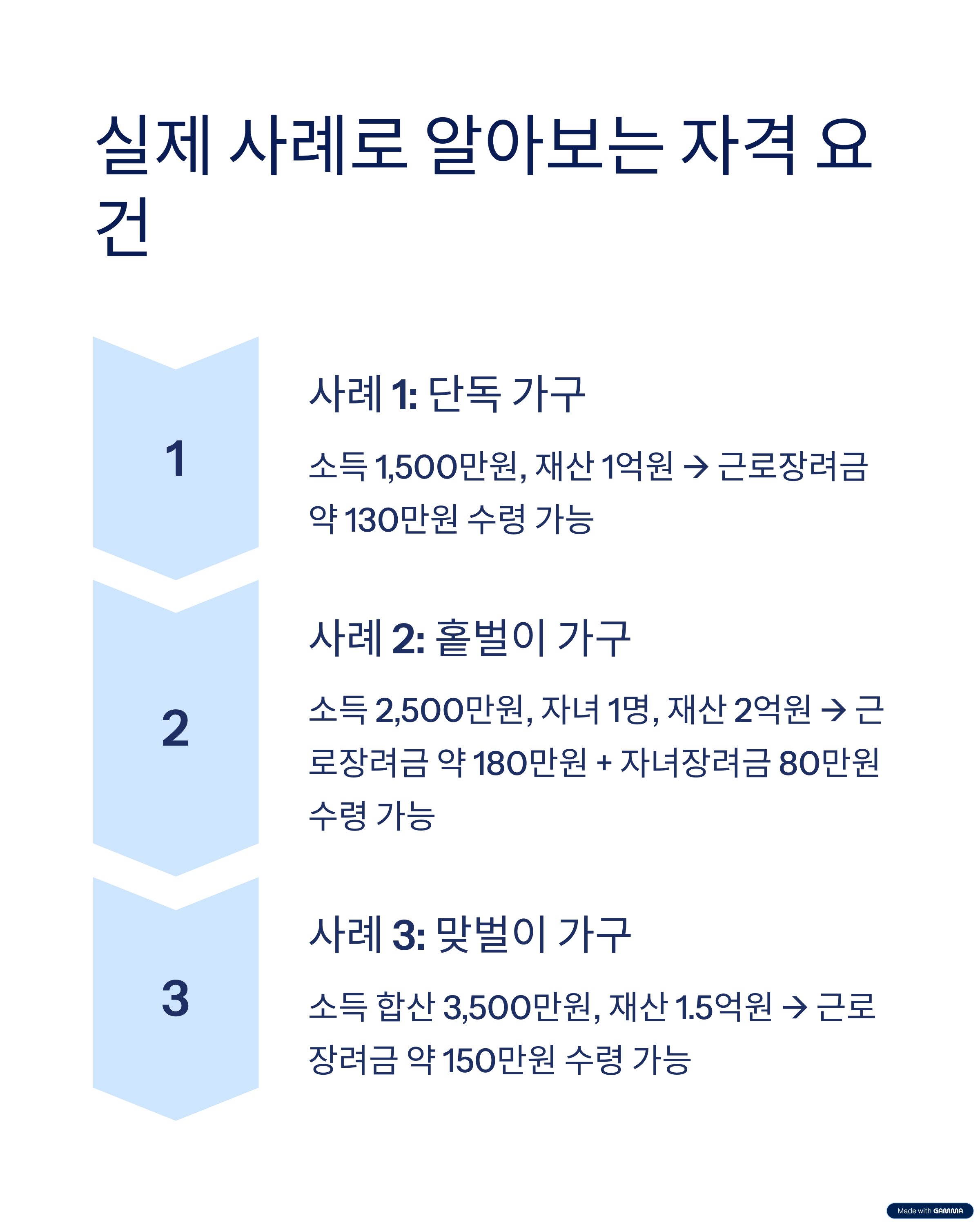 장려금은 가구 유형과 소득 구간에 따라 다르게 지급됩니다.