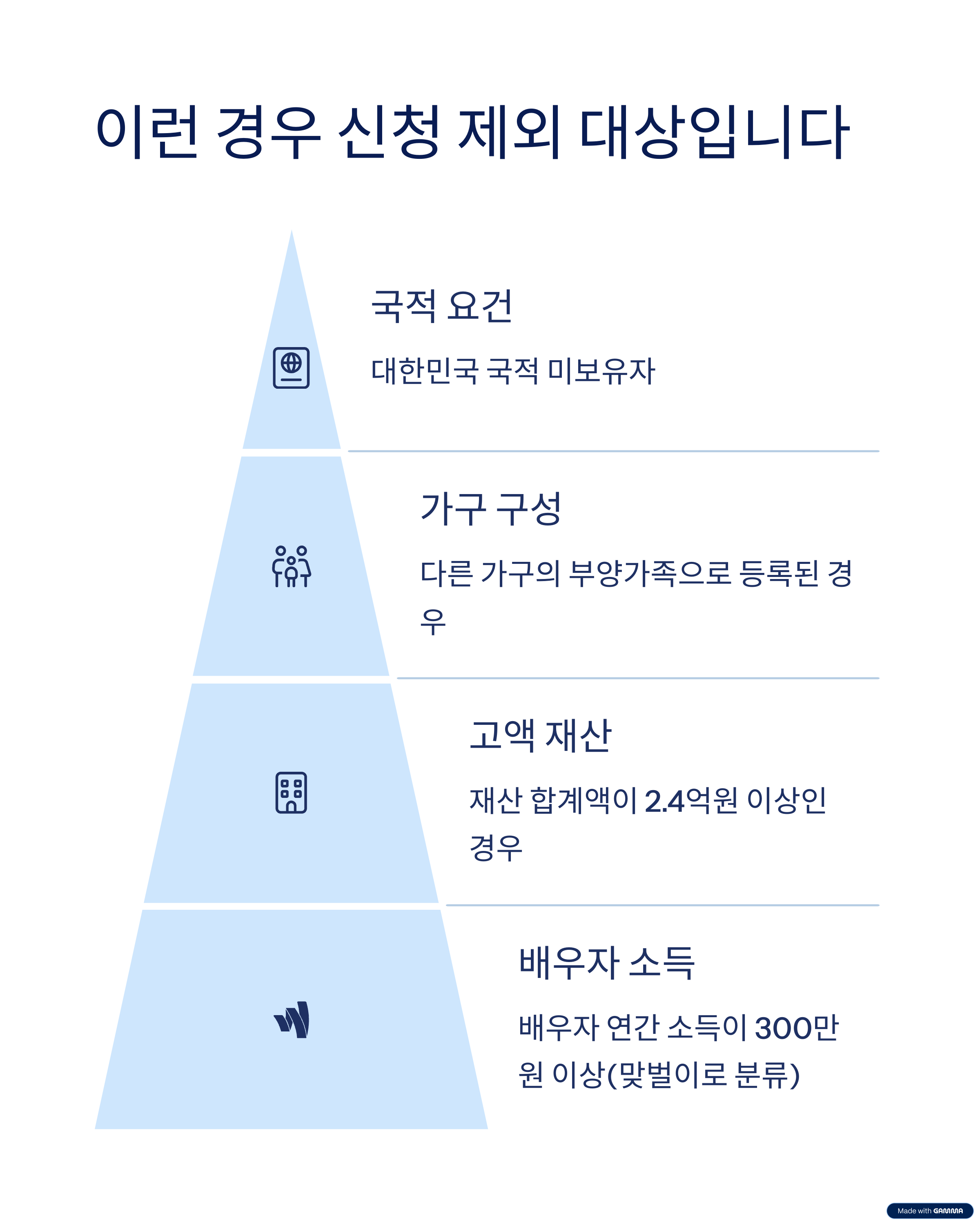 - 외국 국적자 (단, 한국인 배우자나 자녀가 있으면 예외)
