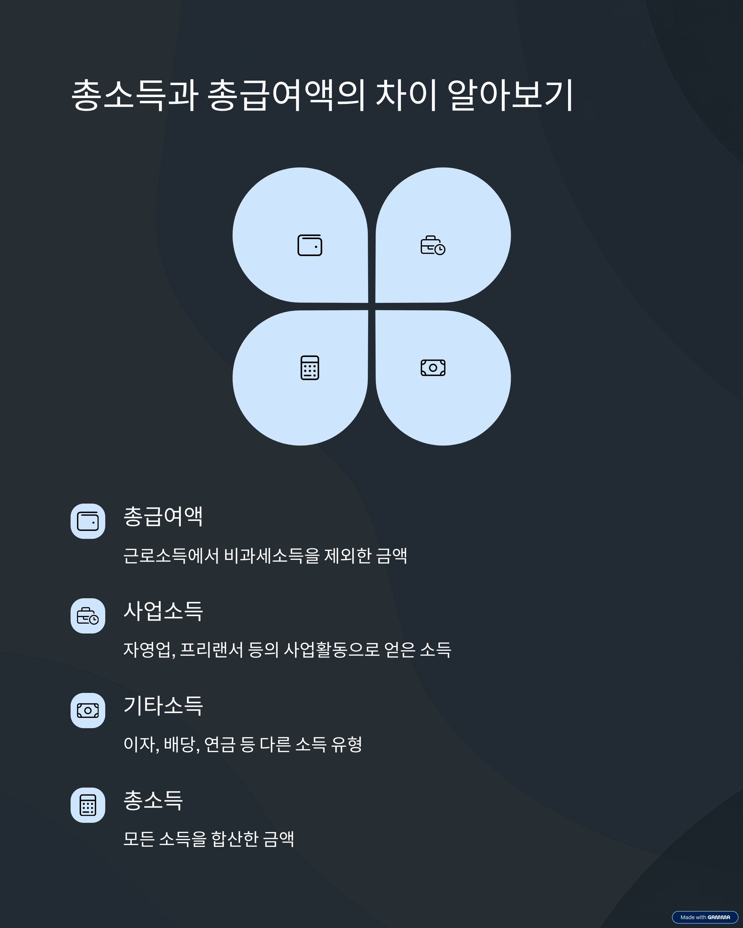 총소득은 근로, 사업, 이자, 배당, 연금, 기타 소득을 모두 포함한 금액입니다.