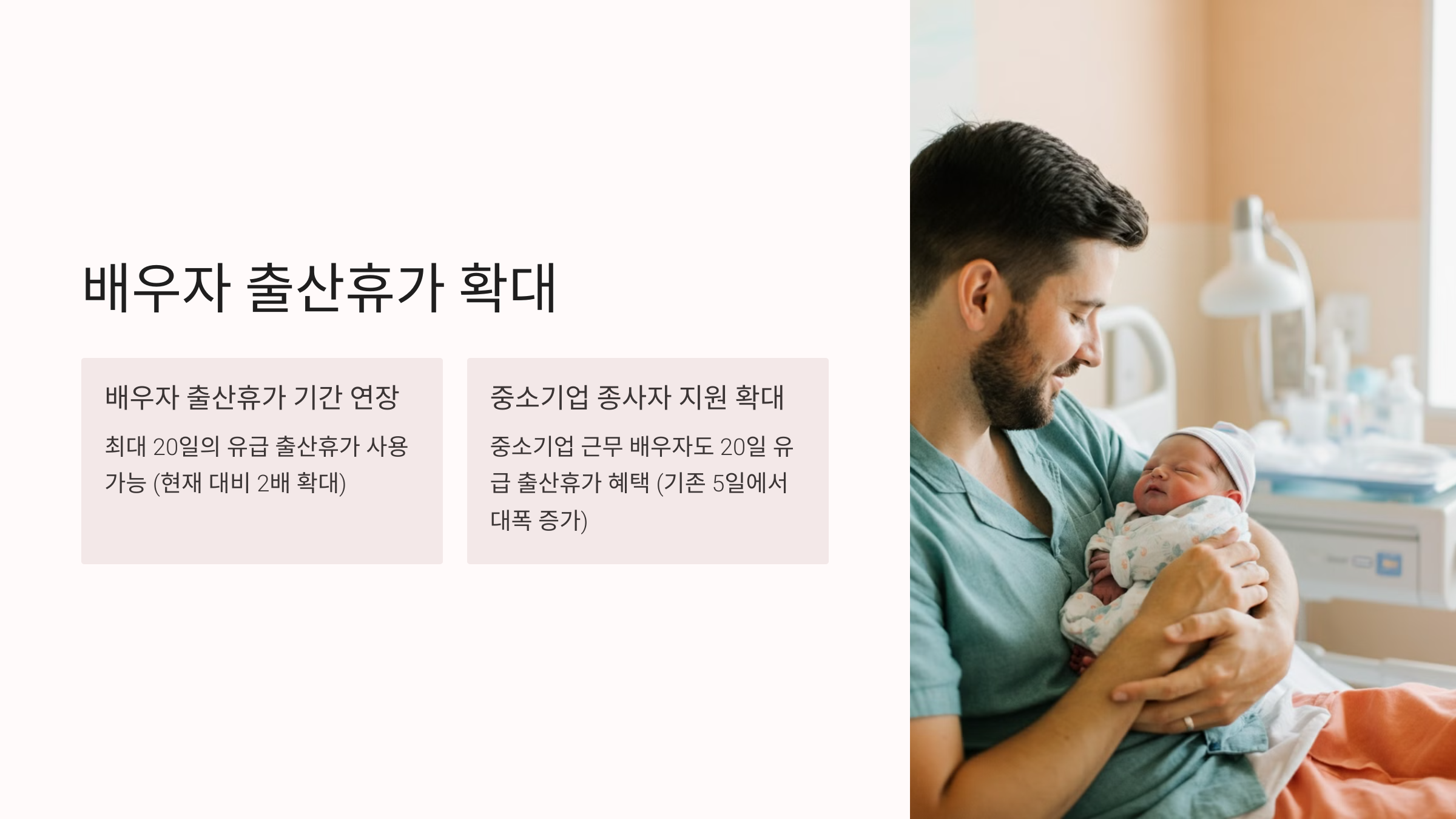 중소기업에 근무하는 배우자는 20일의 유급 출산휴가 혜택을 받을 수 있으며, 기존 5일에서 대폭 늘어났습니다.